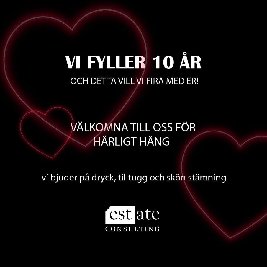 För att fira våra 10 år som företag välkomnar vi er till öppet hus hos oss på Estate Consulting!